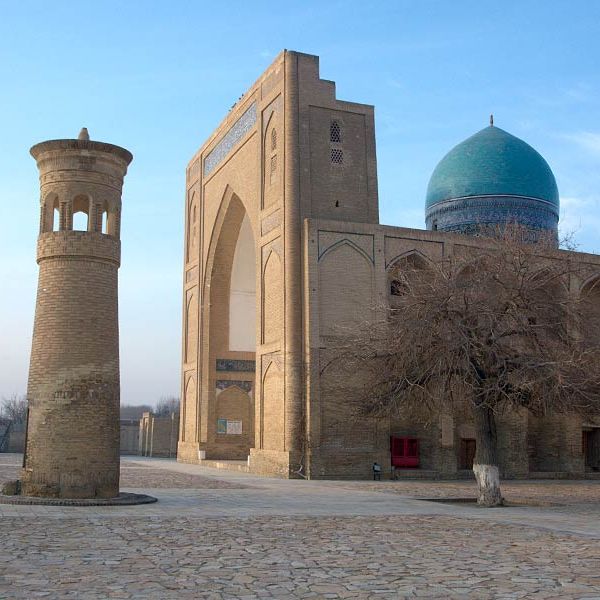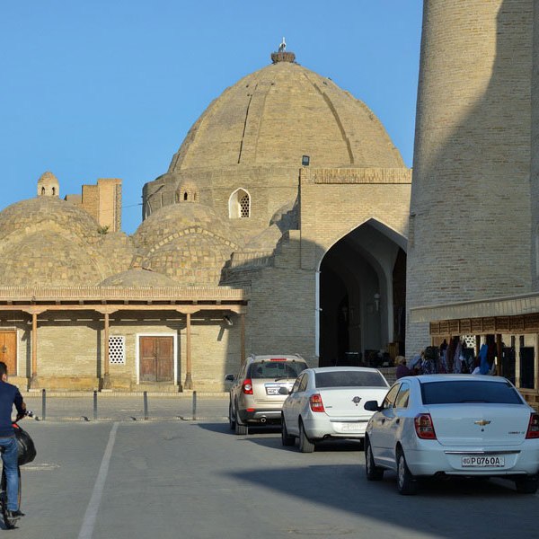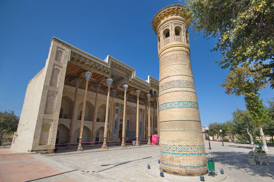 Mosquée. La mosquée Kalyan est l’un des monuments les plus remarquables de Boukhara qui remonte au XVème siècle. Selon les données des fouilles archéologiques la mosquée originale de l’époque des karakhanides a été détruite par un incendie et démantelée, apparemment au moment de l’invasion mongole. La disposition de la mosquée Juma (appelée la mosquée Kalyan) est traditionnelle : une cour rectangulaire avec une grande et haute salle de maksura sur le côté ouest. Chacun des axes de la cour possède un grand aïwan et le périmètre de la cour est constitué de galeries à piliers (il y a 208 piliers et 288 dômes). La maksura est carrée et comporte des niches profondément enfoncées sur l’axe transversal et un mihrab sur l’axe principal. La dalle est typique du début du XVème siècle : un octaèdre de pendentifs arqués soutient un dôme intérieur voûté et est surmonté d’un dôme extérieur sphérique bleu sur un tambour. Cette structure domine toujours l’horizon de Boukhara. La construction de la mosquée a été achevée en 1514 sous la direction d’Oubaïdulla-khan.