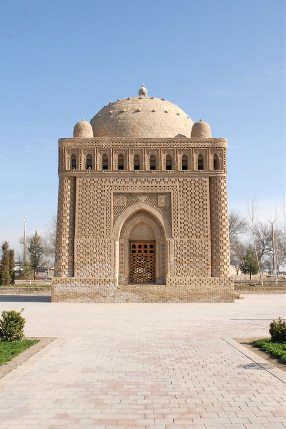 L’impressionnante tombe d’Ismael Samani est l’édifice le plus ancien de Boukhara, conservé dans état original. Ce cube de briques a été édifié à la fin du 10 siècle et appartient à la dynastie samanide (875-999). Ce monument dynastique qui a reçu le nom du fondateur Ismaël Samani, a également les dépouilles des autres membres de la famille. L’édifice est constitué d’un cube, surmonté d’un dôme semi sphérique. L’architecture du mausolée reflète les soleils circulaires et la forme de l’édifice représentant l’univers, symbole de la terre et de la stabilité. Ici des volumes simples : un cube qui surmonte une de sphère, une construction en briques cuites, des colonnes d’angle de trois quart, un ensemble de briques de dimensions et de volumes différents avec un dessin permettant des jeux de lumière sur la façade. Tout ceci reste exceptionnel dans l’histoire de l’architecture de l’Asie Centrale et de L’Iran. Le mausolée de Samanides est sans doute l’un des plus beaux joyaux de l’architecture de l’Asie Centrale.