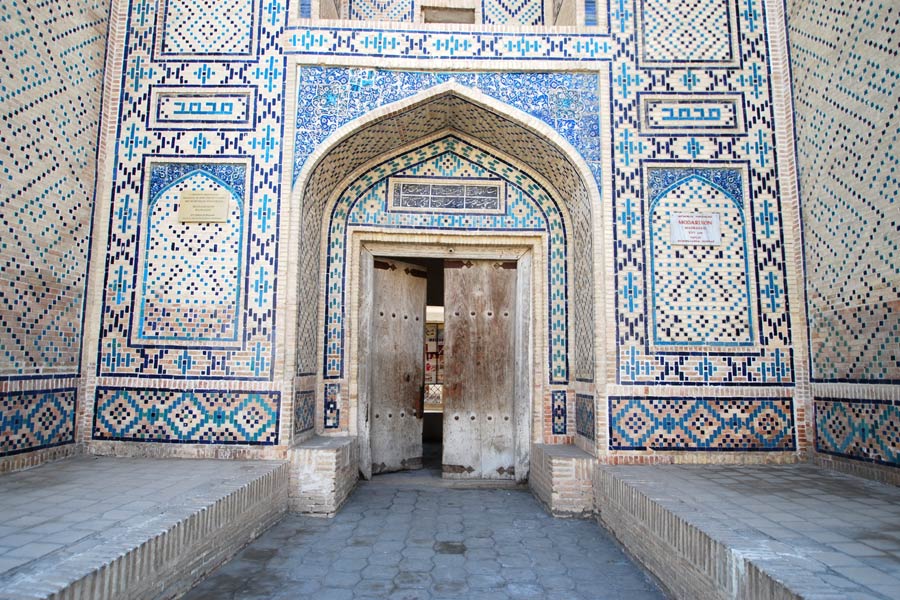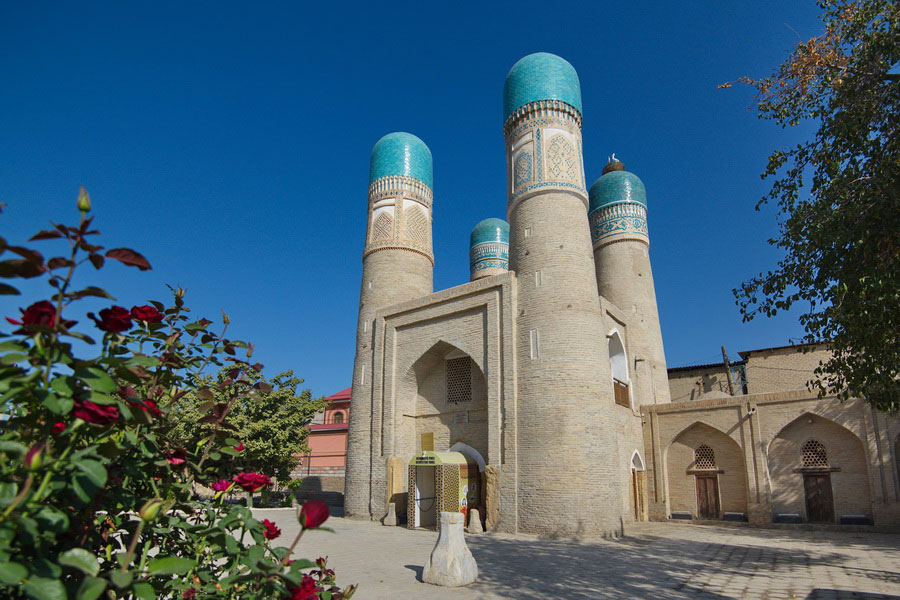 En parlant des monuments inhabituels de Boukhara, nous devrions tout d’abord souligner la médersa Tchor-Minor. Elle est située juste derrière Lyabi-Khaouz, dans l’espace ouvert. « Tchor-Minor » se traduit comme « quatre minarets ». Ce nom est bien justifié: les coins du bâtiment de la médersa, de forme rectangulaire et carrée, sont en réalité décorés de quatre petits minarets couronnés de coupoles bleues, dont les décors diffèrent les uns des autres. Chacun des quatre minarets a une forme différente. Les éléments de décor des tours sont censés refléter la compréhension philosophique et religieuse des quatre religions du monde. Au moins, il est facile de voir que certains éléments ressemblent à une croix, à un poisson chrétien et à la roue de prière bouddhiste.