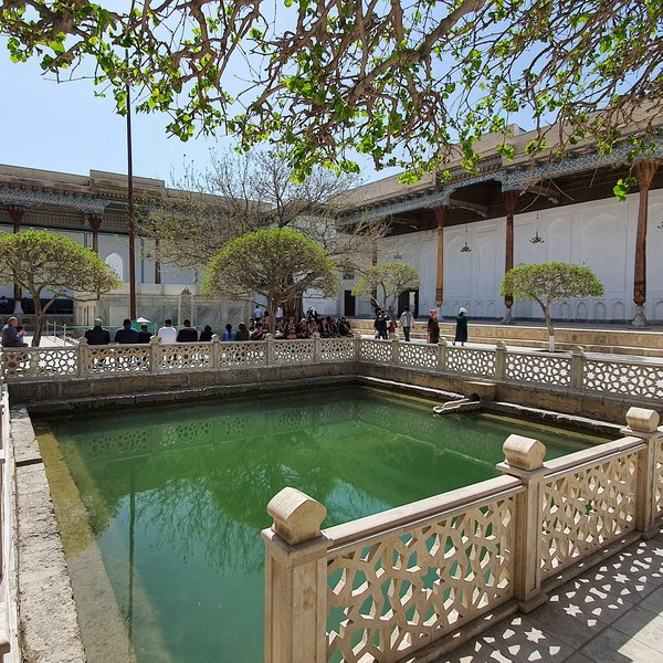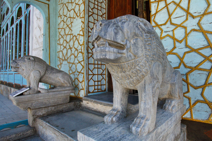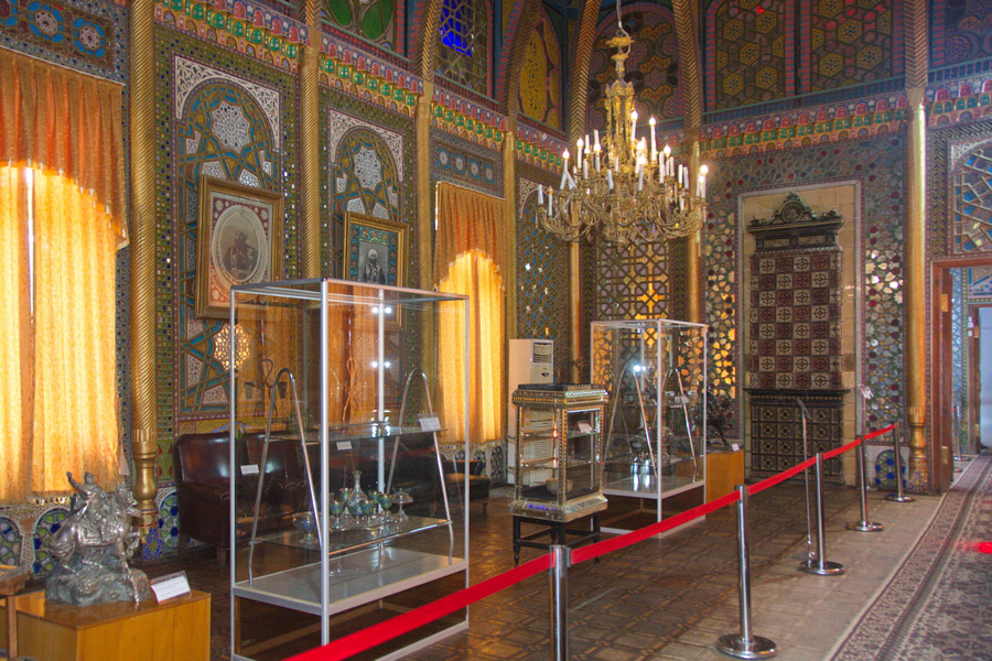 Le salon de thé d’été mérite une attention particulière. Contrairement aux autres salles du palais, décorées de motifs floraux, elle est décorée d’ornements géométriques multicolores et de verre coloré. Le rapprochement de l’Orient et de l’Occident, à Sitoraï Mohi Khossa se ressent à chaque pas. Ici, les jardins d’Eden côtoient les miroirs vénitiens, le mobilier européen aux niches traditionnelles pour la vaisselle, le jeu des rayons du soleil à l’aube, avec la lumière des lustres massifs, la nuit. Les émirs de Boukhara, comme les monarques européens, appréciaient la solitude et la proximité de la nature, c’est pourquoi le palais a été construit à quatre kilomètres de Boukhara. Sur le territoire du palais, il y a un beau jardin et khaouz, où vous pouvez vous cacher du soleil brûlant le jour d’été à Boukhara. Aujourd’hui, Sitoraï Mohi Khossa, est un musée des arts décoratifs et appliqués, où vous pourrez vous familiariser avec l’histoire de Boukhara et la vie des habitants du palais.