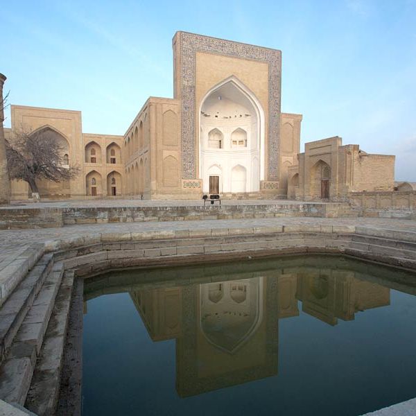 La mosqué Bolo-Khauz est le seul monument qui a conservé sont air initial sur la place Réghistan. Il se trouve en face de la citadelle Ark. Cette mosqué comprend le réservoir d’eau, la mosquée du vendredi et le minaret. La partie la plus ancienne du complexe est le réservoir « khaouz » (ce qui signifie en ouzbek « bassin»), qui est appelé Bolo-Khaouz. Dans le passé, ces réservoirs étaient la source d’eau pour la population et malheureusement une source de nombreuses maladies. C’est pourquoi la plupart d’entre eux ont été vidés. La mosquée Bolo-Khaouz a été construite en 1712 sur ordre de la femme de l’émir de Boukhara. L’autre légende dit que l’émir Chakhmurad (1785-1800) l’a construit pour les prières publiques, parce qu’il aimait être parmi les gens. Malgré le fait qu’à cette époque il y avait un déclin de la culture dans le khanat de Boukhara, l’une des plus belles mosquées de Boukhara a été construite. Un plafond en bois d’aïwan (véranda traditionnelle) qui s’appuie sur des colonnes raffinées est abondamment décoré de fioritures et orné de motifs ornementaux floraux et géométriques. Un court minaret a été construit en 1917 par l’architecte Ousto Chirin Murodov, un célèbre artiste de Boukhara.