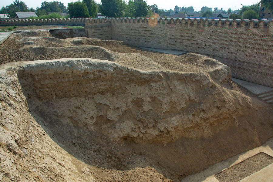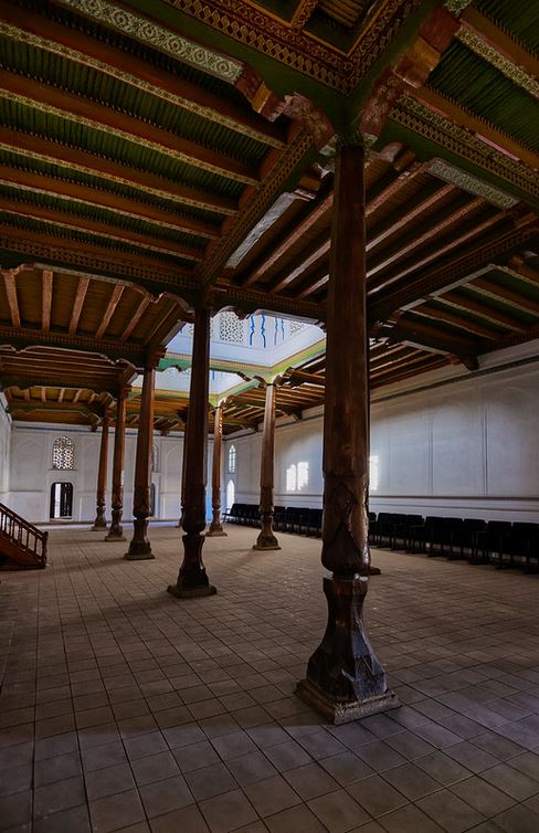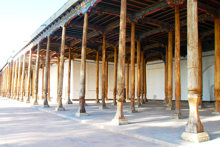 The mosque was built during the reign of Umarkhan (1809-1822). Friday prayers were mostly read here. It was an extended aiwan closed on three sides with a khanaka (closed room) in the center. The dimensions of the mosque’s aiwan are 97.5 by 25.5 meters, which is supported by 98 wooden columns. These columns are made of solid wood, which is why they are called « stone trees ». In front of the mosque there is a minaret with smooth circular masonry of baked bricks and a six-arched lantern crowned with a faceted dome. Its height is 22 meters. Every day, 5 times at the same time, from the top of the minaret, the townspeople are called to prayer by the muezzin.