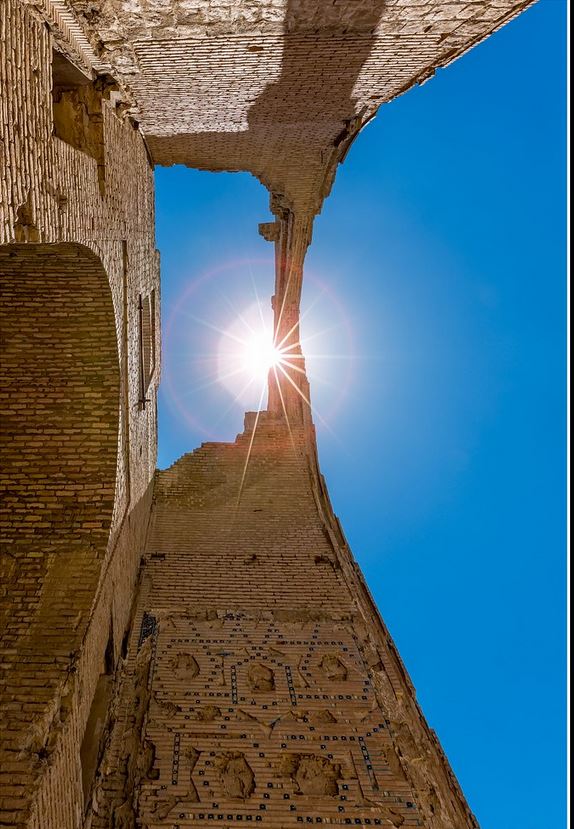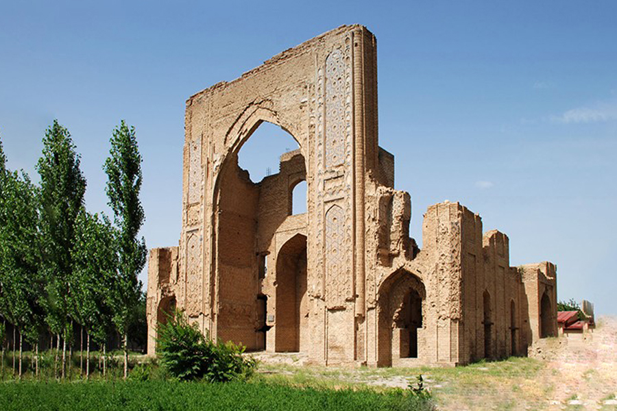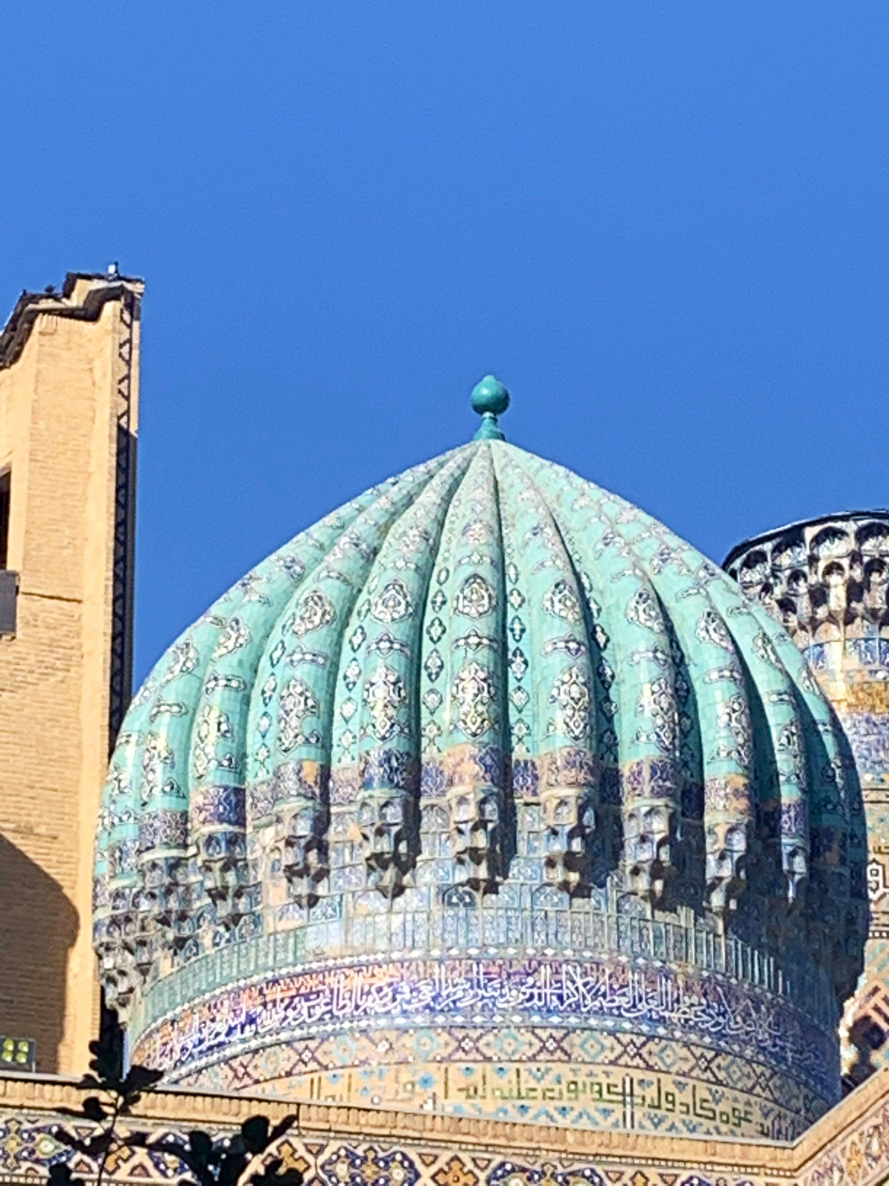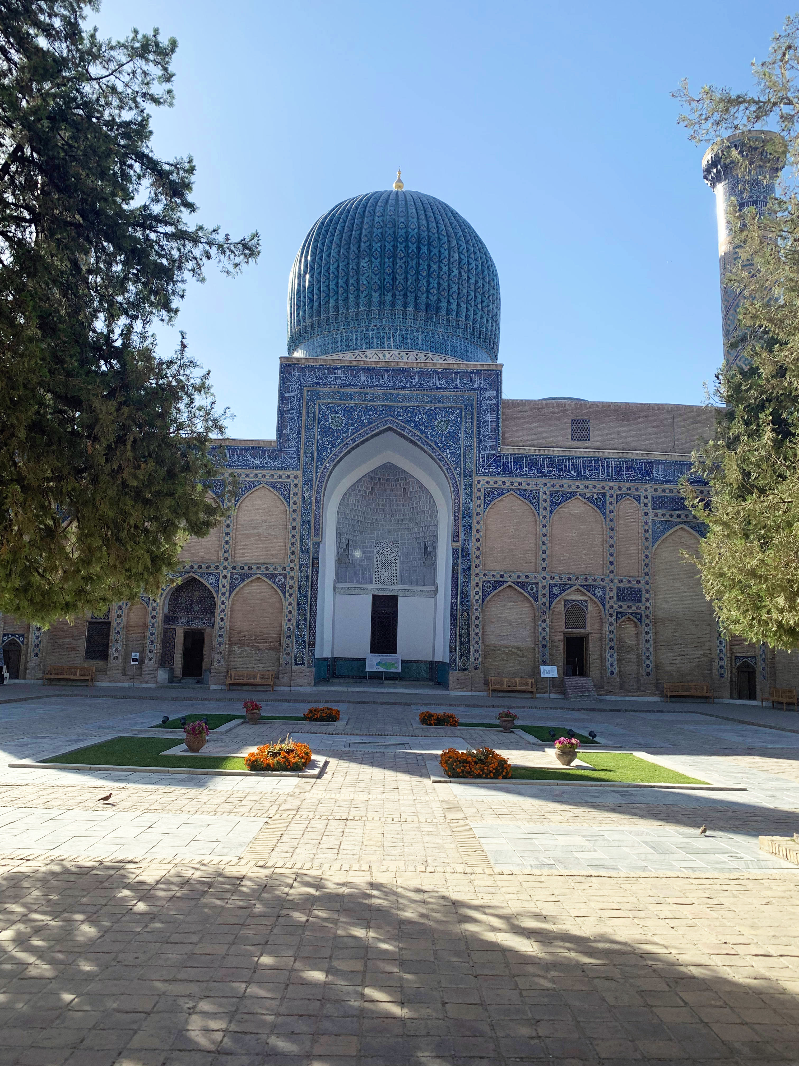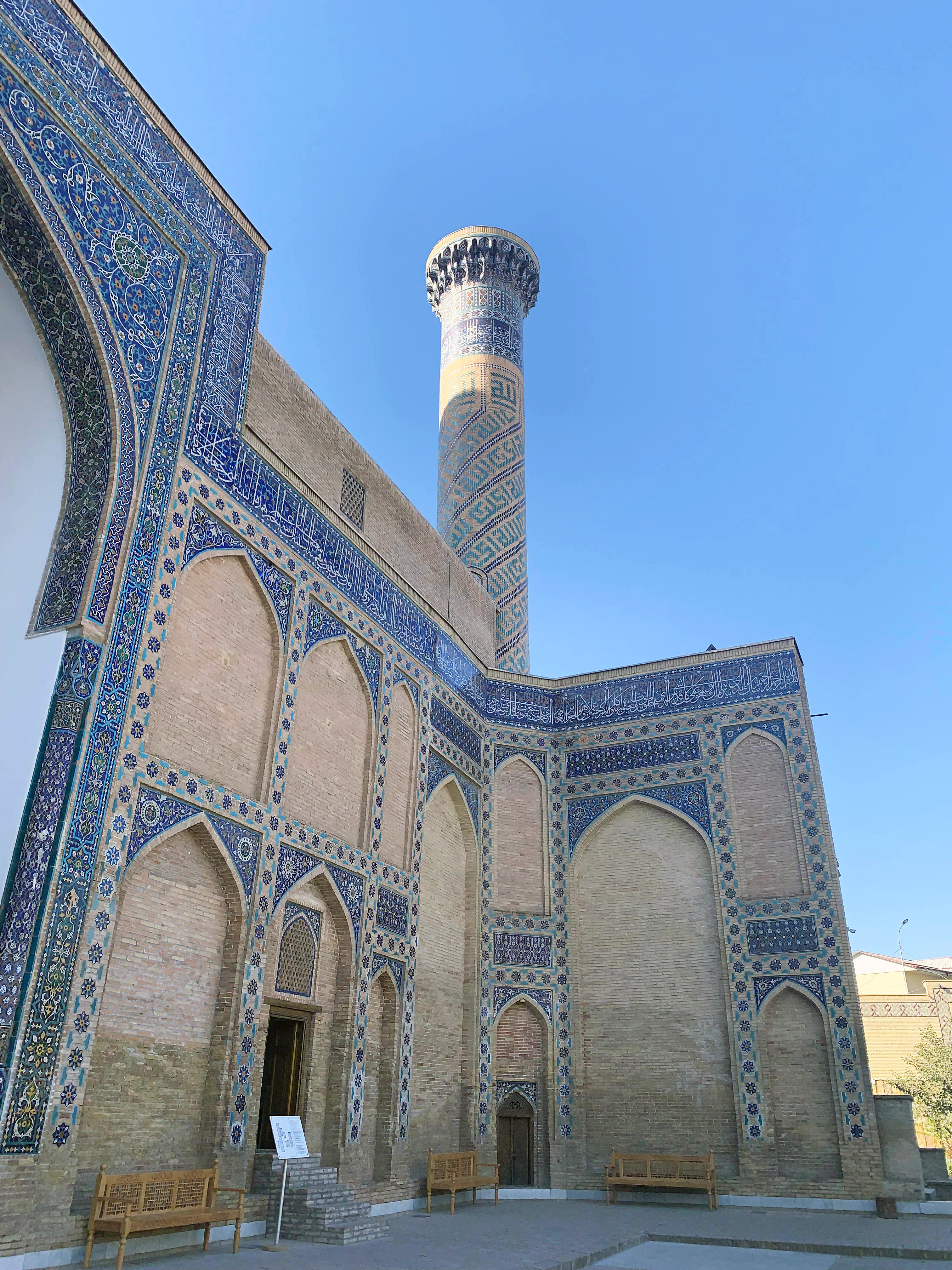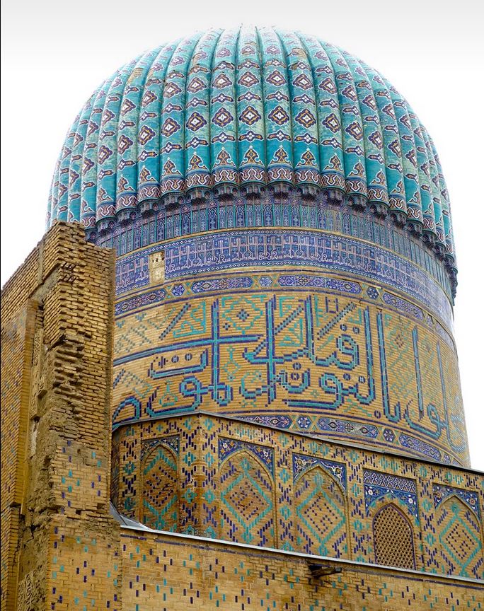 The Bibi-Khanum Mosque (Bibi-Khanum means « Elder Woman ») was erected between 1399-1404 by order of Tamerlane, to commemorate his victorious military campaign in India. According to some rumors, the mosque was built by the wife of Tamerlan – Saray Mulk Khanum or Bibi-Khanum, from which comes the name of the building. It was at this time that a monumental ceremonial style developed in the architecture of Central Asia whose scales corresponded to the well-known saying of Amir Temur: « If you doubt our strength and power, look at our buildings ». . The mosque was built in a short time – in five years. Talented local craftsmen, as well as masons from Azerbaijan, Iran, Khorasan and Hindustan, participated in the construction. To facilitate heavy work, 99 Indian elephants were used.