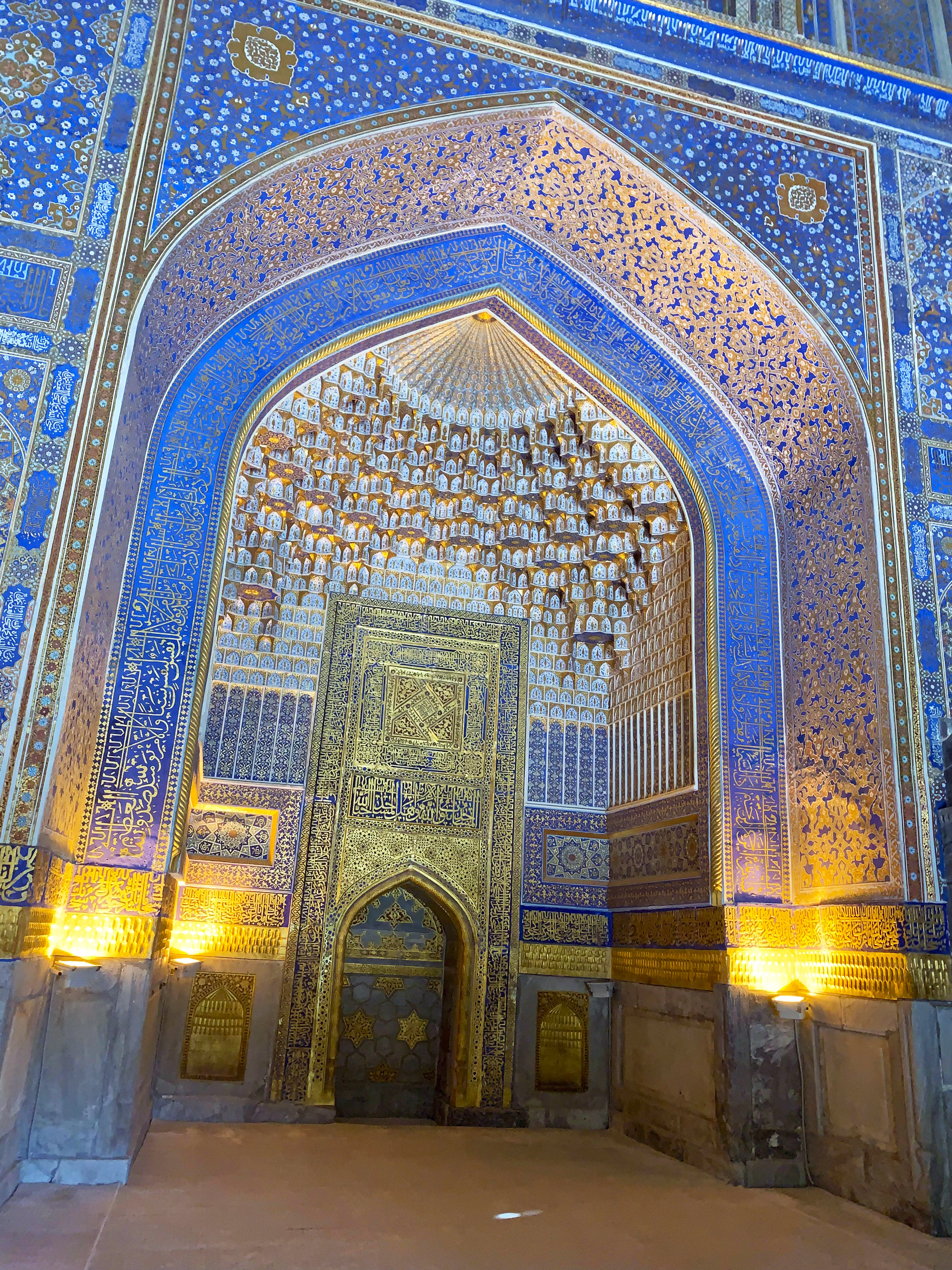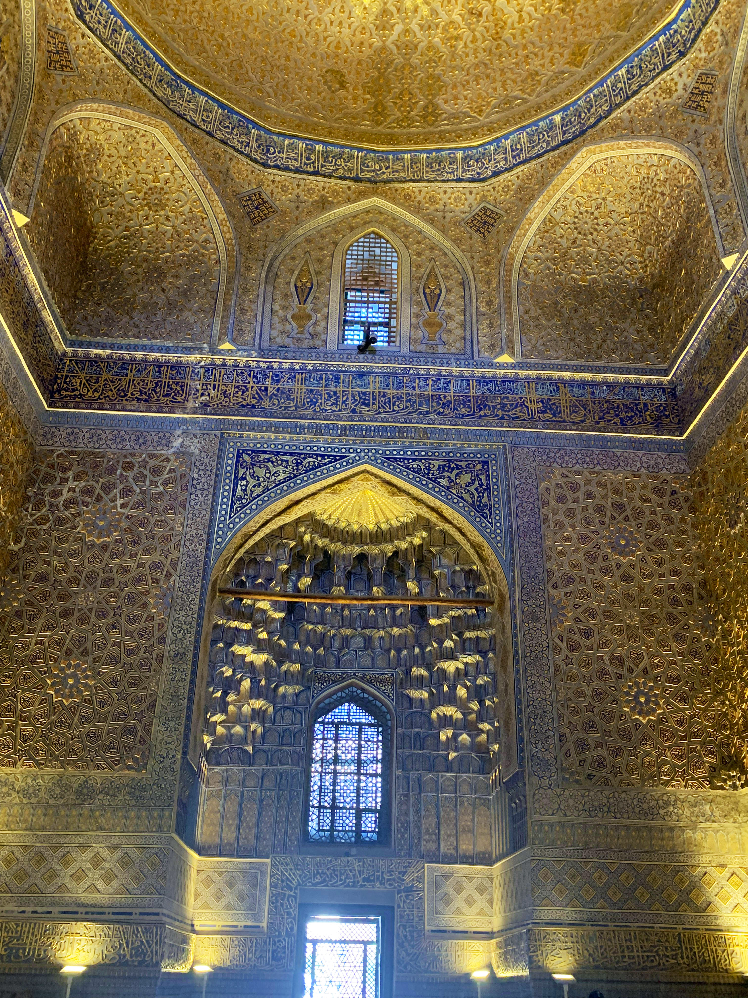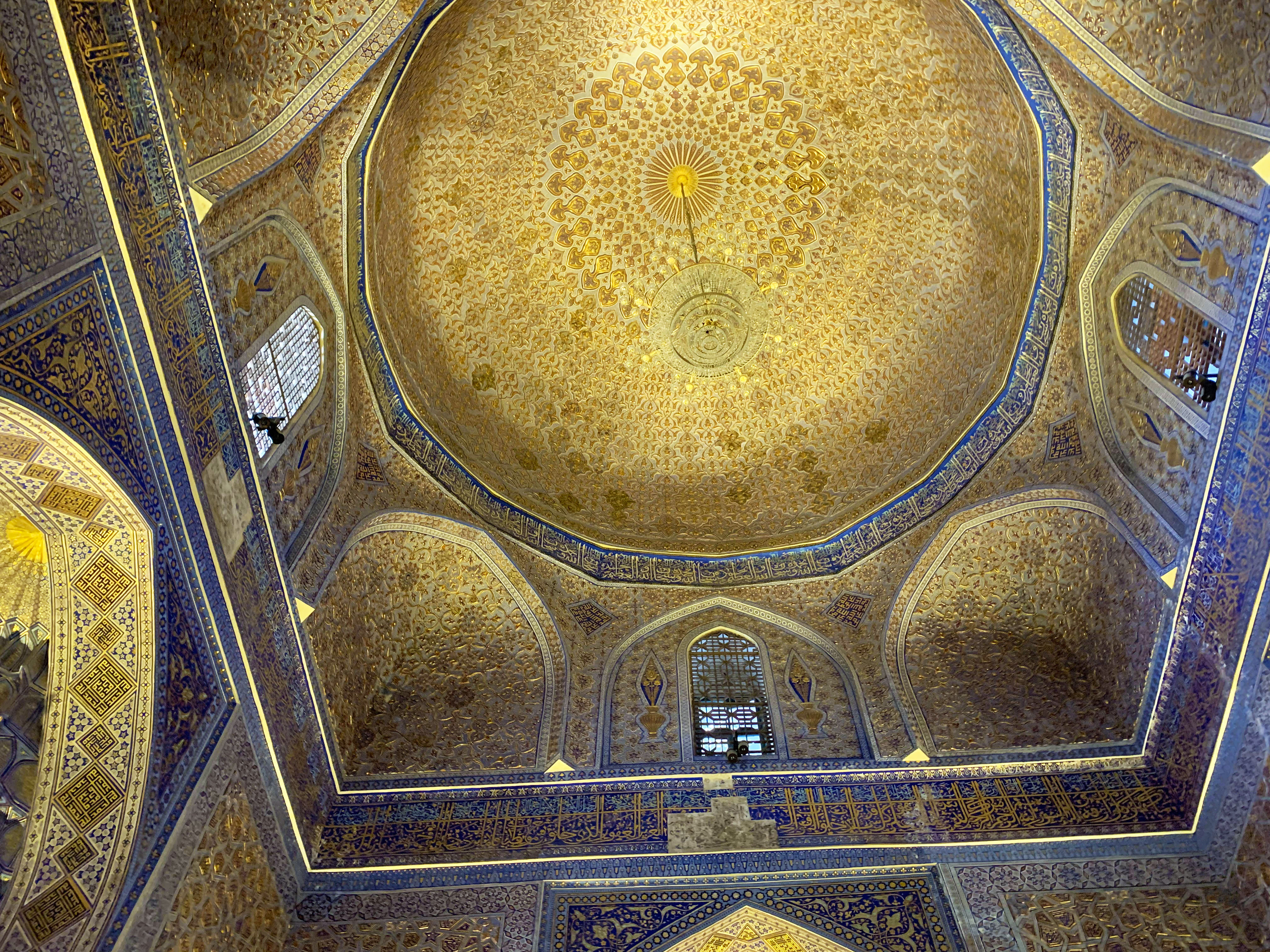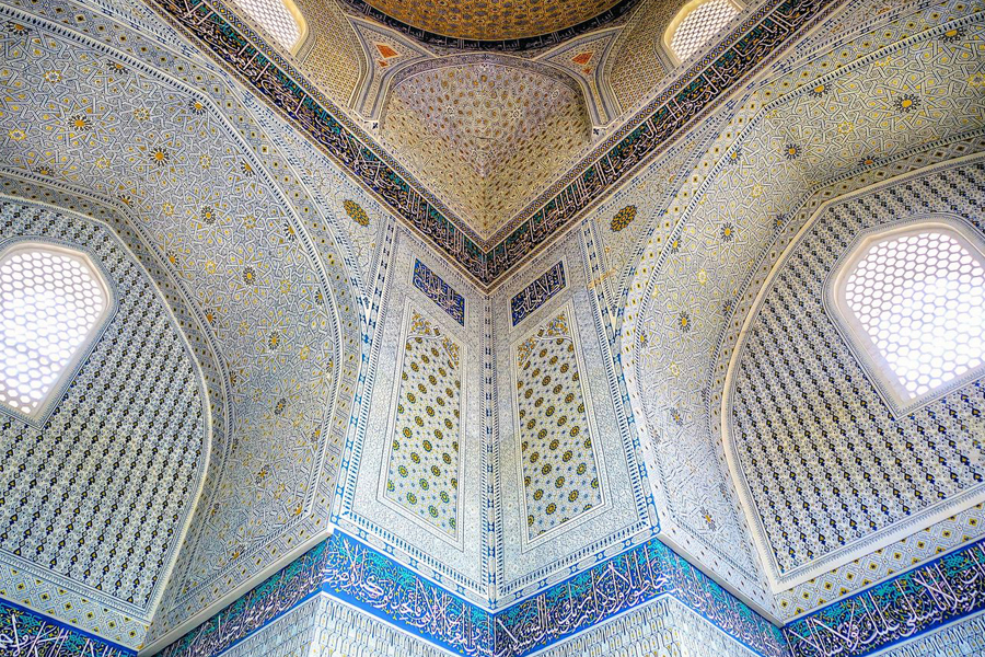 Gur Emir (meaning- « the tomb of the Amir, the ruler) – is the tomb where Amir Temur (Tamerlane), his sons and grandsons are buried. Initially, the mausoleum was intended only for the grandson of Temur, Mohammed Sultan, who died young during a military campaign in 1403. Temur, shocked by the death of his beloved grandson, in whom he saw the heir to the throne, ordered the construction of a mausoleum on the territory of the whole of Prince Mohammed Sultan. He was his eldest son Jahangir’s grandson and replaced Timur in his absence, being considered his successor to the throne. The exterior is adorned by the glazed bricks and mosaic of earthenware. The gadrooned dome, 12.5 meters high and 15 meters in diameter below, has 64 ribs, The interior is majestically adorned with gilded decorations and onyx (semi-precious stone). The tombstones in the center of the room are only used as decorations.The tombs, as for them, are in the same order underground, in the crypt.