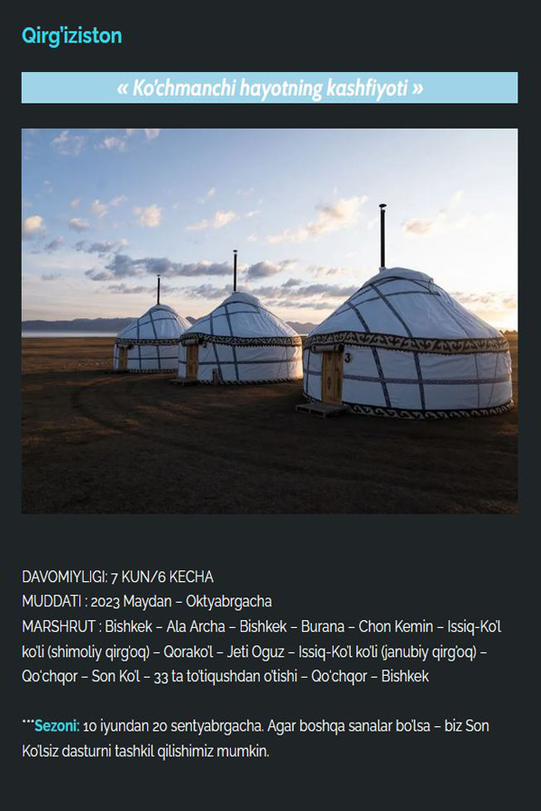 MARSHRUT : Bishkek – Ala Archa – Bishkek – Burana – Chon Kemin – Issiq-Ko’l ko’li (shimoliy qirg’oq) – Qorako’l – Jeti Oguz – Issiq-Ko’l ko’li (janubiy qirg’oq) – Qo‘chqor – Son Ko’l – 33 ta to’tiqushdan o’tishi – Qo‘chqor – Bishkek