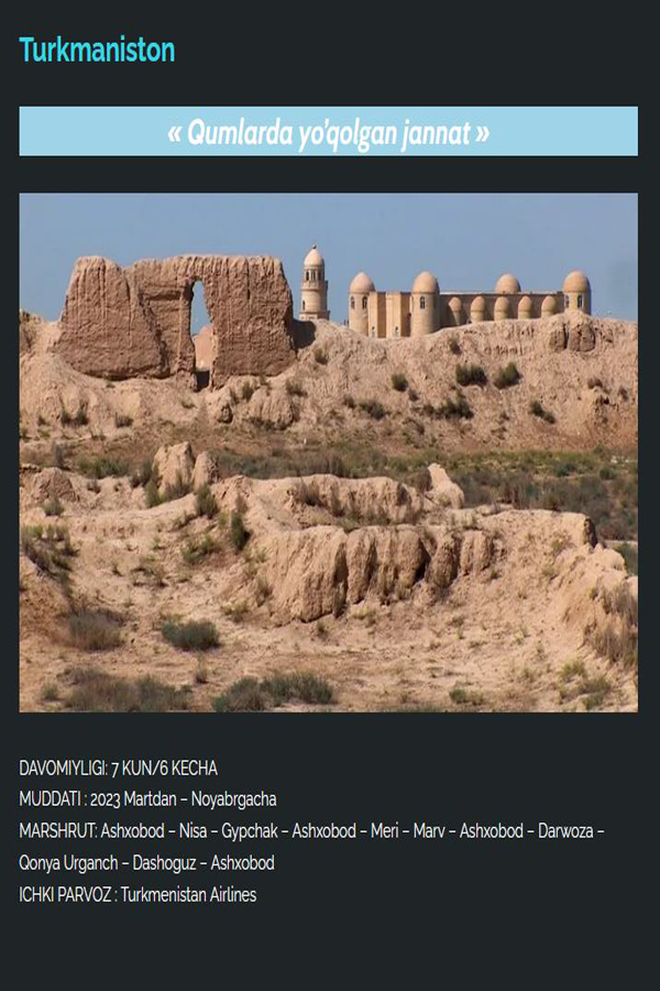 MARSHRUT: Ashxobod – Nisa – Gypchak – Ashxobod – Meri – Marv – Ashxobod – Darwoza – Qonya Urganch – Dashoguz – Ashxobod